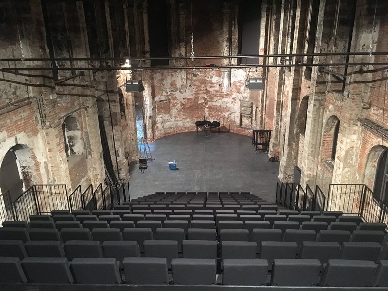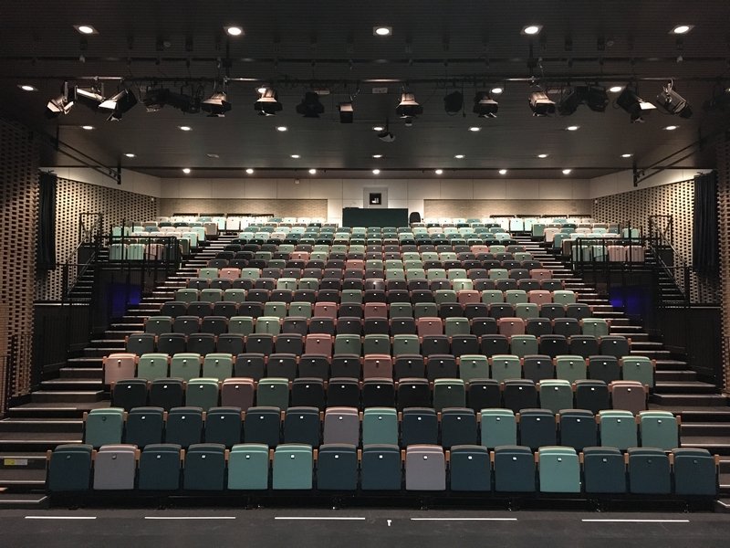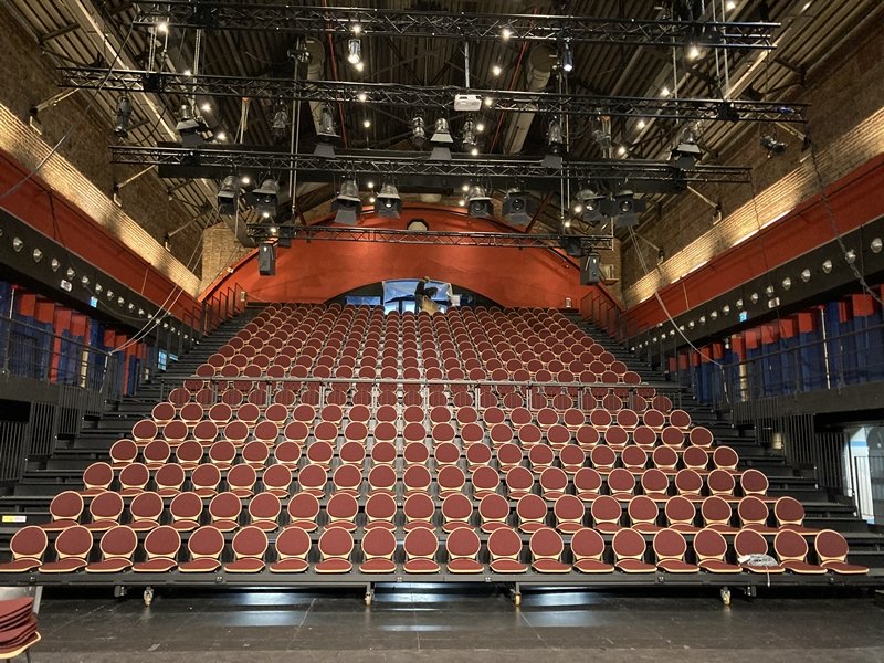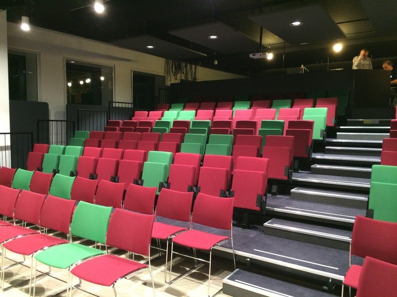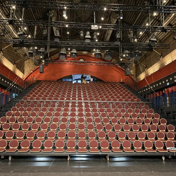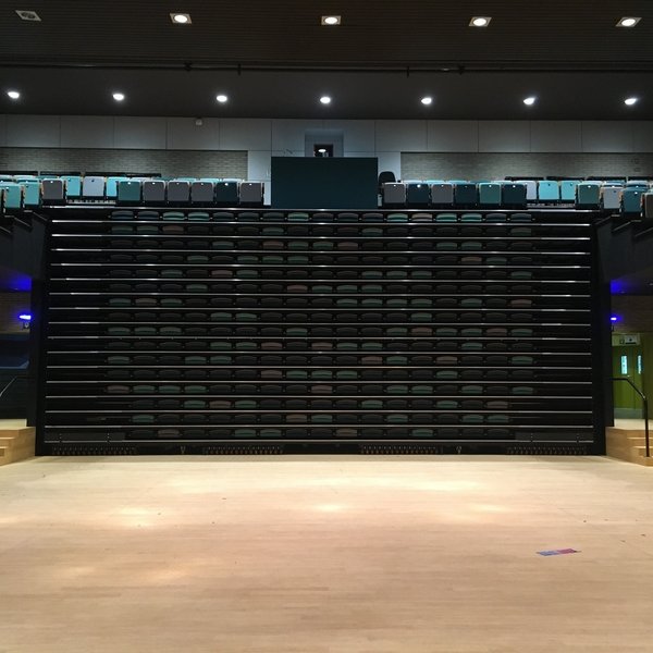 Stand rétractable dans la bibliothèque publique d'Amsterdam, à l'emplacement Oosterdokskade. Entraîné par un système de chaîne de poussée. Placé sur un sol informatique surélevé | COS Tribune