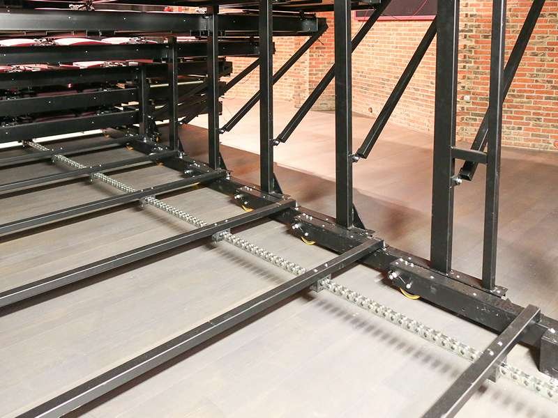 Outre l'ouverture et la fermeture de la tribune, ce système assure la stabilité de la structure métallique complète. En position ouverte, la chaîne et le système de transmission constituent une liaison fixe d'arrière en avant et de gauche à droite. Votre public marche ainsi sur une tribune fixe !
